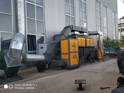 催化廢氣燃燒處理設(shè)備是將廢氣_行吸附、脫附濃縮,使得廢氣濃度合適,再到廢氣燃燒爐內(nèi)燃燒,從而降低燃燒成本。有機(jī)廢氣在引風(fēng)機(jī)的作用下通入活性炭吸附箱,由于活性炭具有微孔多、比表面積大、吸附能力強(qiáng)的特性,將有機(jī)廢氣吸附在活性炭的微孔內(nèi),此時(shí)潔凈空氣被排出。