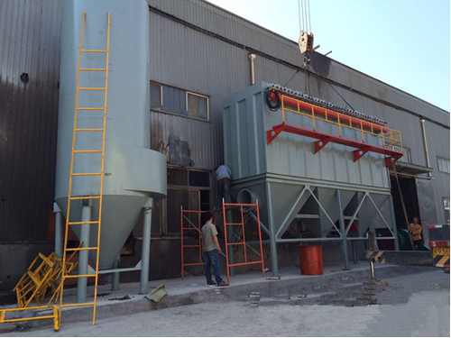 含塵煙氣由進風管道進入中箱體下部,在擋風板形成的預分離室內(nèi),較大顆粒粉塵因慣性作用落入灰斗。煙氣向上到達濾袋,粉塵被阻留在濾袋外面,凈化后的煙氣進入袋內(nèi),并經(jīng)袋口進入上箱體,后經(jīng)氣動提升閥由出風管道排出。
